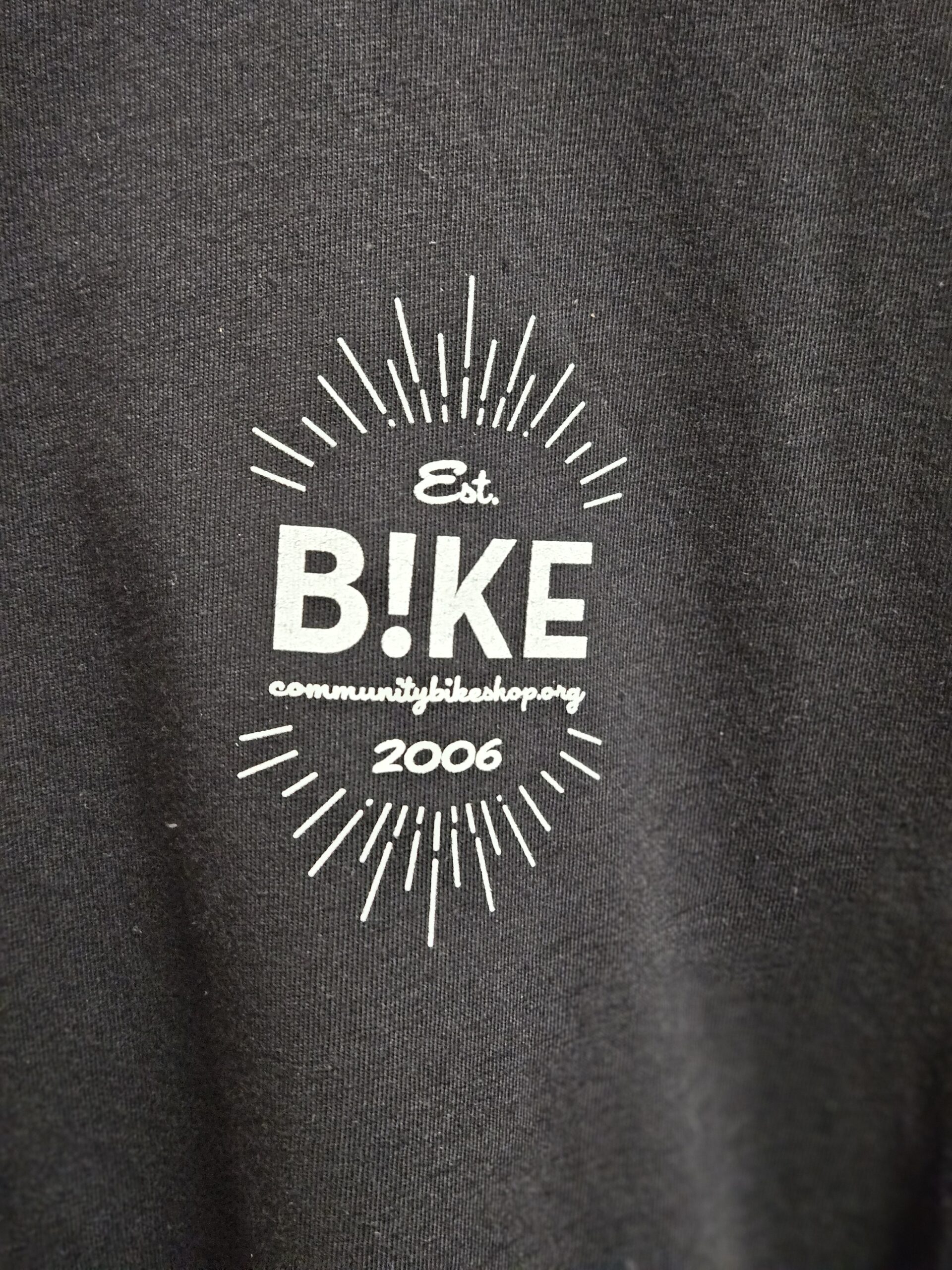 Printed by Renegade Apparel, on a 100% Cotton blank, made in Canada by Rebel apparel. These shirts are a black base, with white screen printing on front and back. The font shows a 2×3 inch B!KE logo on the left breast, and the back shows a newer 1.5×3 inch logo on the nape of the neck.